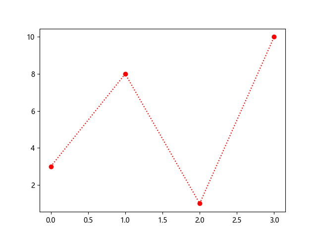 # 这三行代码使编译器能够绘图: import sys import matplotlib matplotlib.use('Agg') import matplotlib.pyplot as plt import numpy as np ypoints = np.array([3, 8, 1, 10]) # 使用圆形标记、点线样式和红色绘制 plt.plot(ypoints, 'o:r') plt.show() # 这两行代码使编译器能够输出图形: plt.savefig(sys.stdout.buffer) sys.stdout.flush()