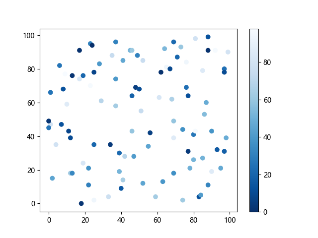 # 这三行代码使编译器能够绘图: import sys import matplotlib matplotlib.use('Agg') import matplotlib.pyplot as plt import numpy as np x = np.random.randint(100, size=(100)) y = np.random.randint(100, size=(100)) colors = np.random.randint(100, size=(100)) # 使用反向蓝色渐变绘制散点图: plt.scatter(x, y, c=colors, cmap='Blues_r') plt.colorbar() # 显示颜色条 plt.show() # 显示图形 # 这两行代码使编译器能够输出图形: plt.savefig(sys.stdout.buffer) sys.stdout.flush()