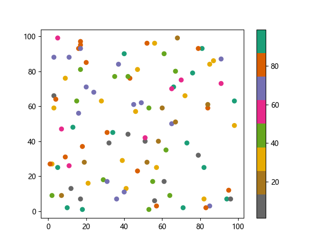 # 这三行代码使编译器能够绘图: import sys import matplotlib matplotlib.use('Agg') import matplotlib.pyplot as plt import numpy as np x = np.random.randint(100, size=(100)) y = np.random.randint(100, size=(100)) colors = np.random.randint(100, size=(100)) # 使用反向 Dark2 配色方案绘制散点图: plt.scatter(x, y, c=colors, cmap='Dark2_r') plt.colorbar() plt.show() # 这两行代码使编译器能够输出图形: plt.savefig(sys.stdout.buffer) sys.stdout.flush()