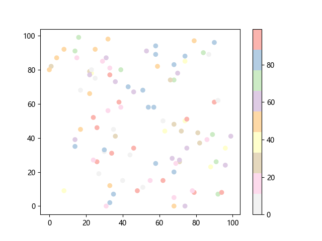 # 这三行代码使编译器能够绘图: import sys import matplotlib matplotlib.use('Agg') import matplotlib.pyplot as plt import numpy as np x = np.random.randint(100, size=(100)) y = np.random.randint(100, size=(100)) colors = np.random.randint(100, size=(100)) # 绘制反向 Pastel1 配色方案的散点图: plt.scatter(x, y, c=colors, cmap='Pastel1_r') plt.colorbar() plt.show() # 这两行代码使编译器能够输出图形: plt.savefig(sys.stdout.buffer) sys.stdout.flush()