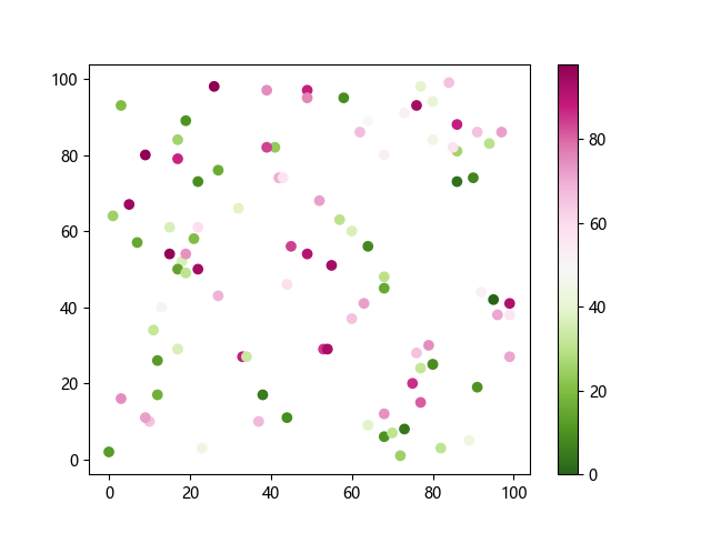 # 这三行代码使编译器能够绘图: import sys import matplotlib matplotlib.use('Agg') import matplotlib.pyplot as plt import numpy as np # 生成随机数据: x = np.random.randint(100, size=(100)) y = np.random.randint(100, size=(100)) colors = np.random.randint(100, size=(100)) # 使用 PiYG_r 配色方案绘制粉绿反向渐变色散点图: plt.scatter(x, y, c=colors, cmap='PiYG_r') plt.colorbar() # 显示颜色条 plt.show() # 显示图形 # 这两行代码使编译器能够输出图形: plt.savefig(sys.stdout.buffer) sys.stdout.flush()