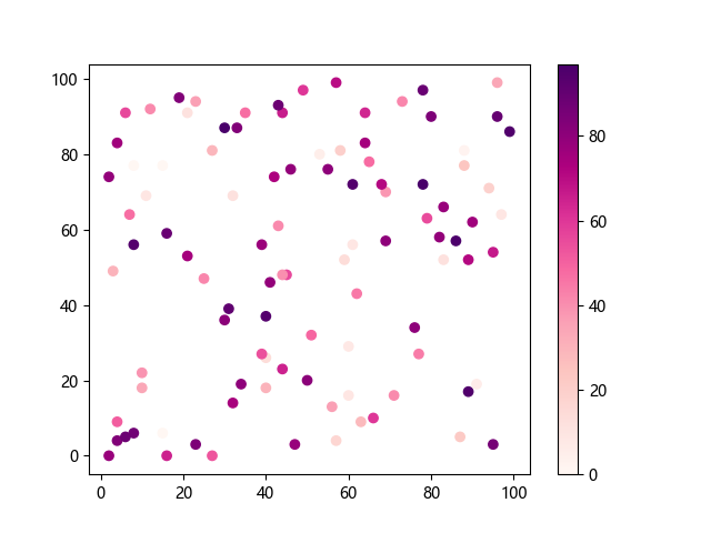 # 这三行代码使编译器能够绘图: import sys import matplotlib matplotlib.use('Agg') import matplotlib.pyplot as plt import numpy as np # 生成随机数据 x = np.random.randint(100, size=(100)) y = np.random.randint(100, size=(100)) colors = np.random.randint(100, size=(100)) # 使用 RdPu 配色方案绘制红紫色渐变色散点图: plt.scatter(x, y, c=colors, cmap='RdPu') plt.colorbar() # 显示颜色条 plt.show() # 显示图形 # 这两行代码使编译器能够输出图形: plt.savefig(sys.stdout.buffer) sys.stdout.flush()