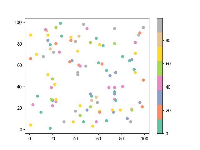 # 这三行代码使编译器能够绘图: import sys import matplotlib matplotlib.use('Agg') import matplotlib.pyplot as plt import numpy as np # 生成随机数据: x = np.random.randint(100, size=(100)) y = np.random.randint(100, size=(100)) colors = np.random.randint(100, size=(100)) # 使用 Set2 (8 色调色板)配色方案绘制 Set2 离散色散点图: plt.scatter(x, y, c=colors, cmap='Set2') plt.colorbar() # 显示颜色条 plt.show() # 显示图形 # 这两行代码使编译器能够输出图形: plt.savefig(sys.stdout.buffer) sys.stdout.flush()