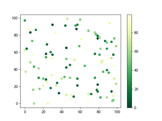 # 这三行代码使编译器能够绘图: import sys import matplotlib matplotlib.use('Agg') import matplotlib.pyplot as plt import numpy as np # 生成随机数据: x = np.random.randint(100, size=(100)) y = np.random.randint(100, size=(100)) colors = np.random.randint(100, size=(100)) # 使用YlGn_r(黄-绿反向渐变)配色方案绘制散点图: plt.scatter(x, y, c=colors, cmap='YlGn_r') plt.colorbar() # 显示颜色条 plt.show() # 显示图形 # 这两行代码使编译器能够输出图形: plt.savefig(sys.stdout.buffer) sys.stdout.flush()