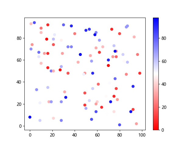 # 这三行代码使编译器能够绘图: import sys import matplotlib matplotlib.use('Agg') import matplotlib.pyplot as plt import numpy as np # 生成随机数据点 x = np.random.randint(100, size=(100)) y = np.random.randint(100, size=(100)) colors = np.random.randint(100, size=(100)) # 使用 bwr_r 配色方案绘制蓝白红反向渐变色散点图: plt.scatter(x, y, c=colors, cmap='bwr_r') plt.colorbar() plt.show() # 这两行代码使编译器能够输出图形: plt.savefig(sys.stdout.buffer) sys.stdout.flush()