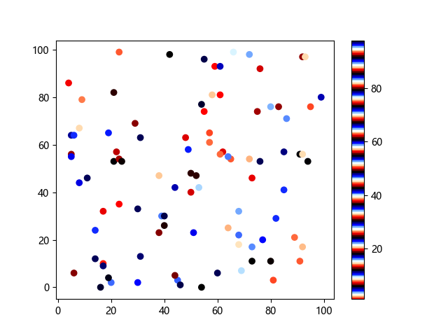 # 这三行代码使编译器能够绘图: import sys import matplotlib matplotlib.use('Agg') import matplotlib.pyplot as plt import numpy as np # 生成随机数据 x = np.random.randint(100, size=(100)) y = np.random.randint(100, size=(100)) colors = np.random.randint(100, size=(100)) # 使用 flag 配色方案绘制旗帜渐变色散点图: plt.scatter(x, y, c=colors, cmap='flag') plt.colorbar() plt.show() # 这两行代码使编译器能够输出图形: plt.savefig(sys.stdout.buffer) sys.stdout.flush()