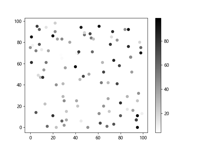 # 这三行代码使编译器能够绘图: import sys import matplotlib matplotlib.use('Agg') import matplotlib.pyplot as plt import numpy as np # 生成随机数据点 x = np.random.randint(100, size=(100)) y = np.random.randint(100, size=(100)) colors = np.random.randint(100, size=(100)) # 使用 gist_gray_r 配色方案绘制灰度反向渐变色散点图: plt.scatter(x, y, c=colors, cmap='gist_gray_r') plt.colorbar() plt.show() # 这两行代码使编译器能够输出图形: plt.savefig(sys.stdout.buffer) sys.stdout.flush()