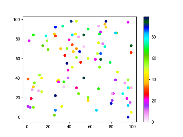 # 这三行代码使编译器能够绘图: import sys import matplotlib matplotlib.use('Agg') import matplotlib.pyplot as plt import numpy as np # 生成随机数据点 x = np.random.randint(100, size=(100)) y = np.random.randint(100, size=(100)) colors = np.random.randint(100, size=(100)) # 使用 gist_ncar_r 配色方案绘制 NCAR 反向渐变色散点图: plt.scatter(x, y, c=colors, cmap='gist_ncar_r') plt.colorbar() plt.show() # 这两行代码使编译器能够输出图形: plt.savefig(sys.stdout.buffer) sys.stdout.flush()