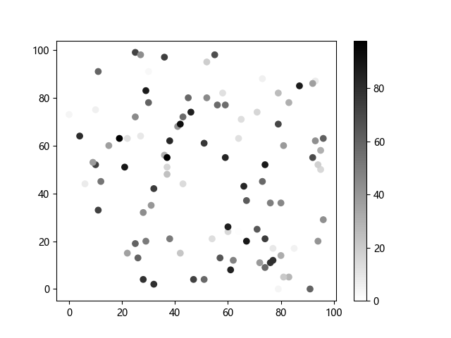 # 这三行代码使编译器能够绘图: import sys import matplotlib matplotlib.use('Agg') import matplotlib.pyplot as plt import numpy as np # 生成随机数据 x = np.random.randint(100, size=(100)) y = np.random.randint(100, size=(100)) colors = np.random.randint(100, size=(100)) # 使用 gist_yarg 配色方案绘制灰度渐变色散点图: plt.scatter(x, y, c=colors, cmap='gist_yarg') plt.colorbar() plt.show() # 这两行代码使编译器能够输出图形: plt.savefig(sys.stdout.buffer) sys.stdout.flush()