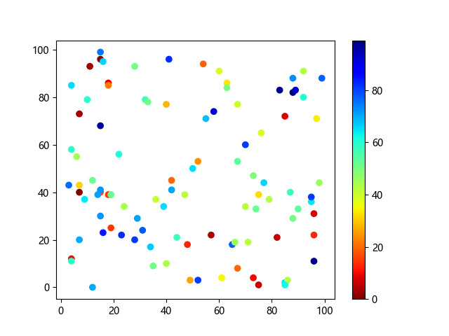 # 这三行代码使编译器能够绘图: import sys import matplotlib matplotlib.use('Agg') import matplotlib.pyplot as plt import numpy as np # 生成随机数据点 x = np.random.randint(100, size=(100)) y = np.random.randint(100, size=(100)) colors = np.random.randint(100, size=(100)) # 使用 jet_r 配色方案绘制 Jet 反向渐变色散点图: plt.scatter(x, y, c=colors, cmap='jet_r') plt.colorbar() plt.show() # 这两行代码使编译器能够输出图形: plt.savefig(sys.stdout.buffer) sys.stdout.flush()