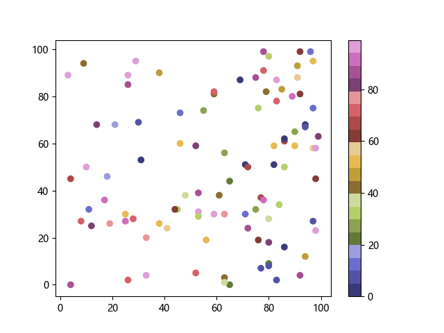 # 以下三行代码使编译器支持绘图功能: import sys import matplotlib matplotlib.use('Agg') import matplotlib.pyplot as plt import numpy as np # 生成随机数据: x = np.random.randint(100, size=(100)) y = np.random.randint(100, size=(100)) colors = np.random.randint(100, size=(100)) # 使用 tab20b 离散配色方案创建散点图: plt.scatter(x, y, c=colors, cmap='tab20b') plt.colorbar() plt.show() # 以下两行代码使编译器能够输出图形: plt.savefig(sys.stdout.buffer) sys.stdout.flush()