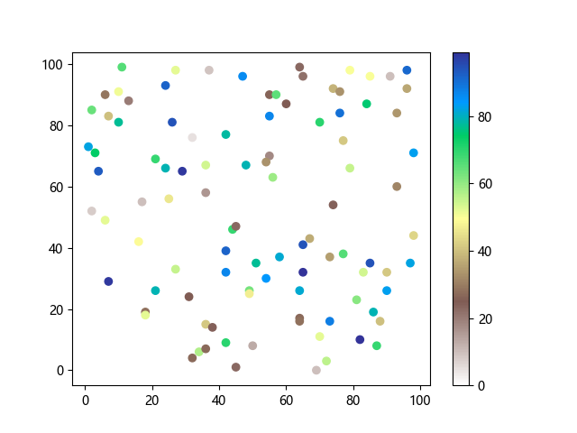 # 以下三行代码使编译器支持绘图功能: import sys import matplotlib matplotlib.use('Agg') import matplotlib.pyplot as plt import numpy as np # 生成随机数据: x = np.random.randint(100, size=(100)) y = np.random.randint(100, size=(100)) colors = np.random.randint(100, size=(100)) # 使用地形反向 (terrain_r) 配色方案创建散点图: plt.scatter(x, y, c=colors, cmap='terrain_r') plt.colorbar() plt.show() # 以下两行代码使编译器能够输出图形: plt.savefig(sys.stdout.buffer) sys.stdout.flush()