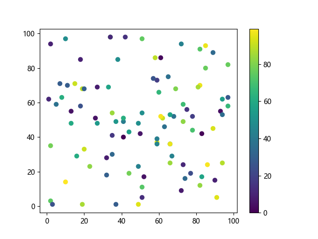 # 以下三行代码使编译器支持绘图功能: import sys import matplotlib matplotlib.use('Agg') import matplotlib.pyplot as plt import numpy as np # 生成随机数据: x = np.random.randint(100, size=(100)) y = np.random.randint(100, size=(100)) colors = np.random.randint(100, size=(100)) # 使用 viridis 配色方案创建散点图: plt.scatter(x, y, c=colors, cmap='viridis') plt.colorbar() plt.show() # 以下两行代码使编译器能够输出图形: plt.savefig(sys.stdout.buffer) sys.stdout.flush()