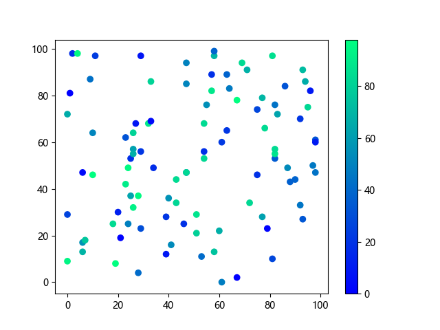# 以下三行代码使编译器支持绘图功能: import sys import matplotlib matplotlib.use('Agg') import matplotlib.pyplot as plt import numpy as np # 生成随机数据: x = np.random.randint(100, size=(100)) y = np.random.randint(100, size=(100)) colors = np.random.randint(100, size=(100)) # 使用冬季 (winter) 配色方案创建散点图: plt.scatter(x, y, c=colors, cmap='winter') plt.colorbar() plt.show() # 以下两行代码使编译器能够输出图形: plt.savefig(sys.stdout.buffer) sys.stdout.flush()